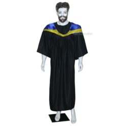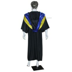 Black Graduation Gown and Cap with Royal Blue and Yellow Hood