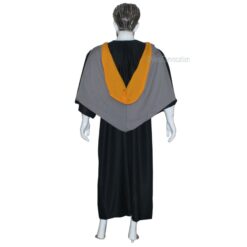 Black Graduation Gown and Cap with Yellow and Grey Hood