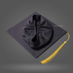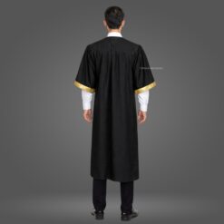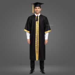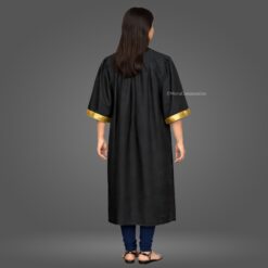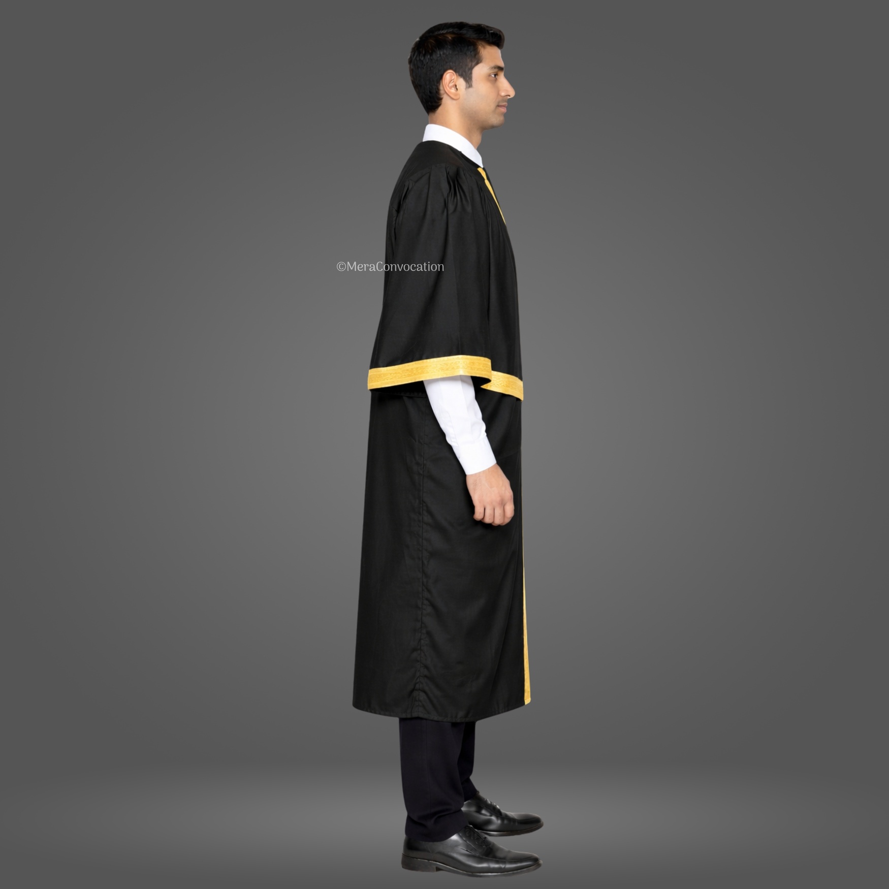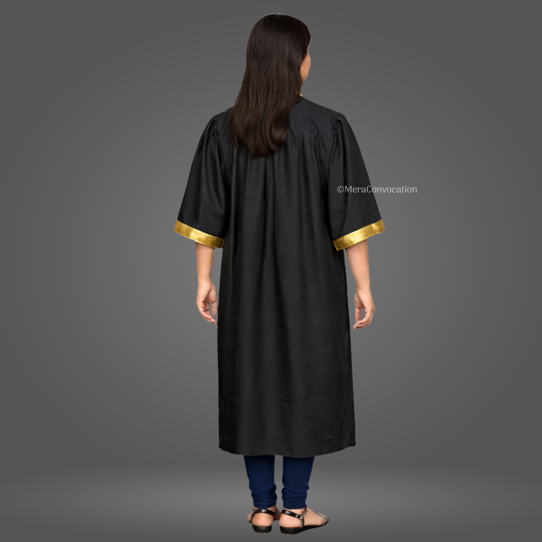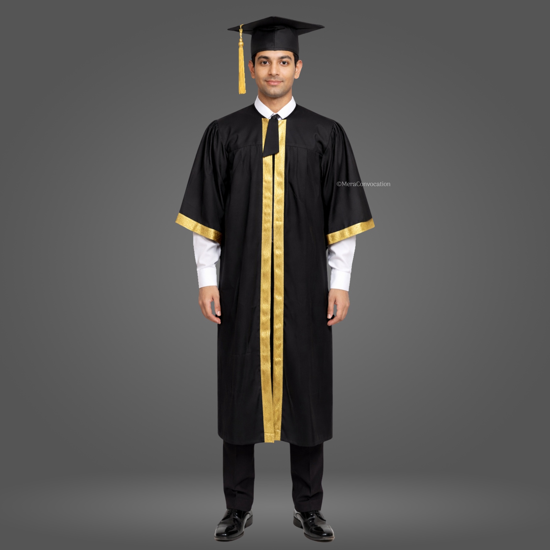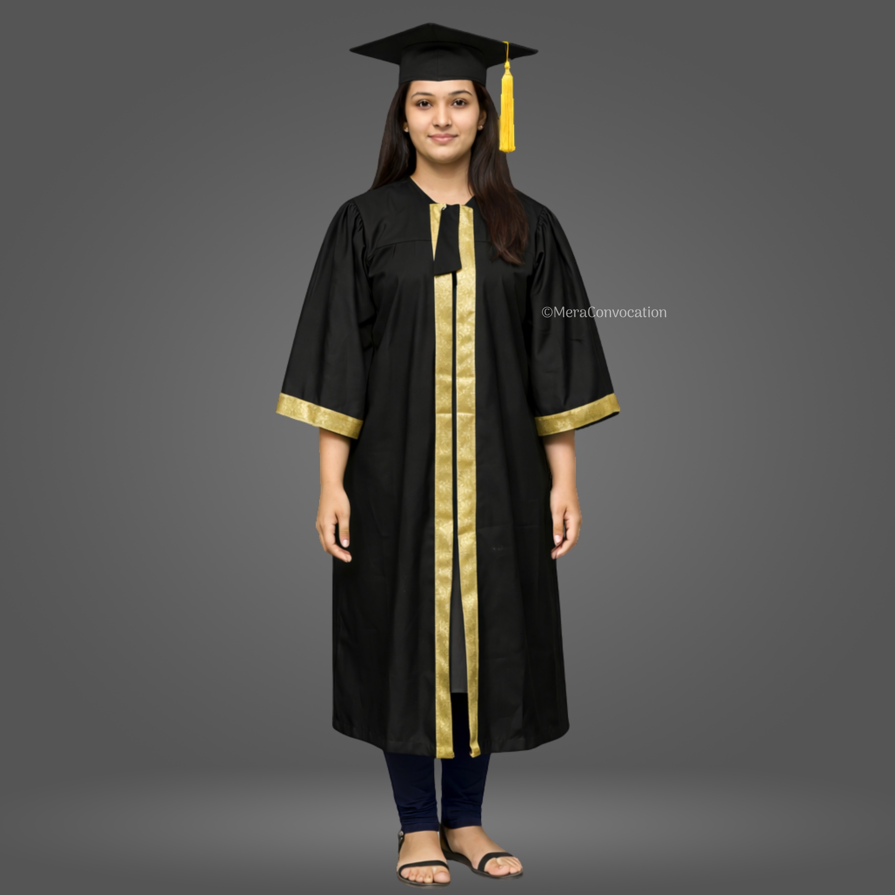 Black Matte Graduation Gown & Cap made from premium micro polyester with a 1.5-inch golden jari border. Perfect for graduates, teachers, HODs, and dignitaries.