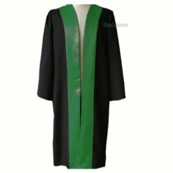 This is Black Matte Finish Graduation Gown with Green Satin Border and Cap. We use the best quality polyester fabric along with the 3 inches of green satin border and front zipper to make this complete set of graduation robes.
