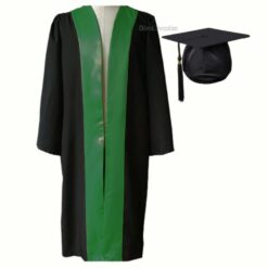 This is Black Matte Finish Graduation Gown with Green Satin Border and Cap. We use the best quality polyester fabric along with the 3 inches of green satin border and front zipper to make this complete set of graduation robes.