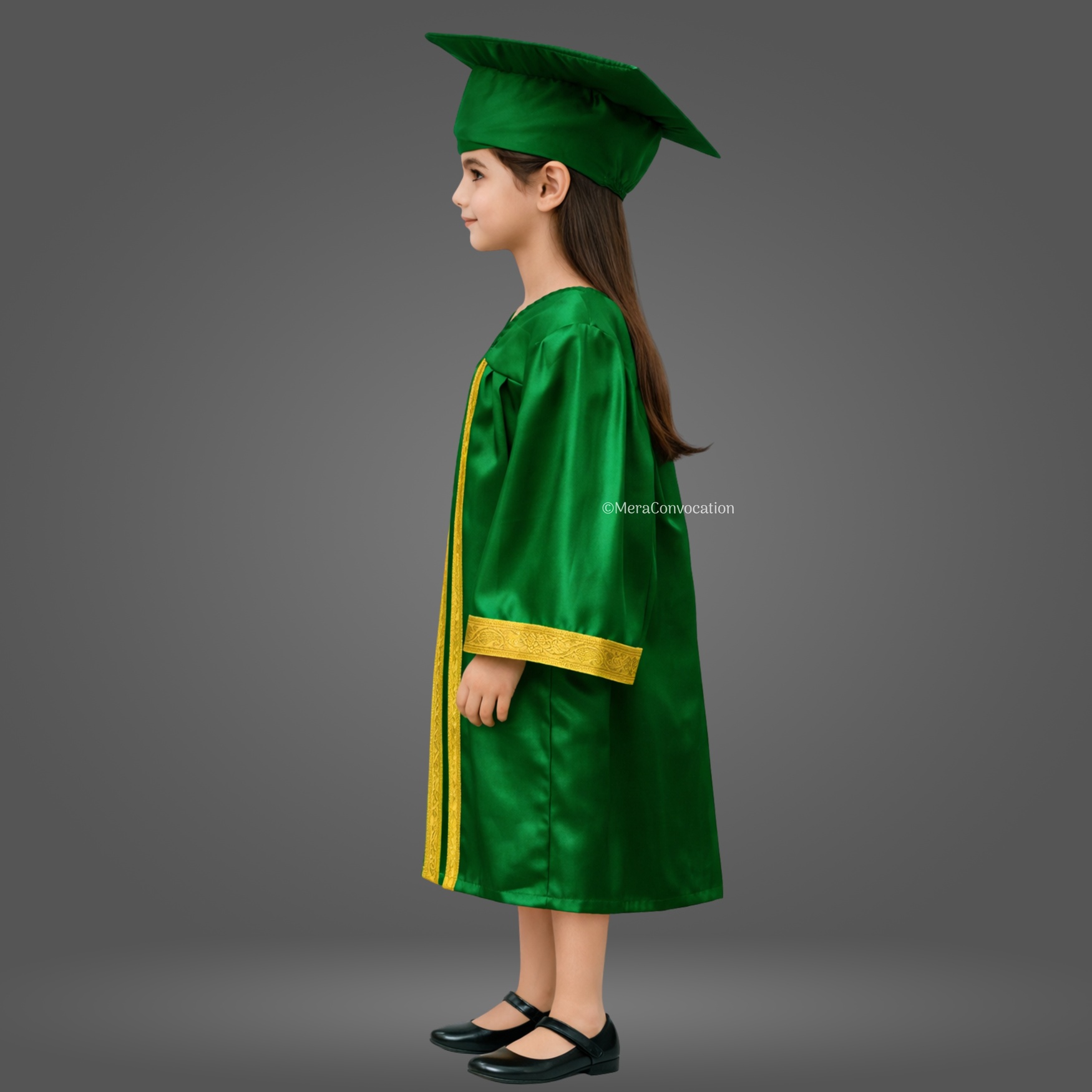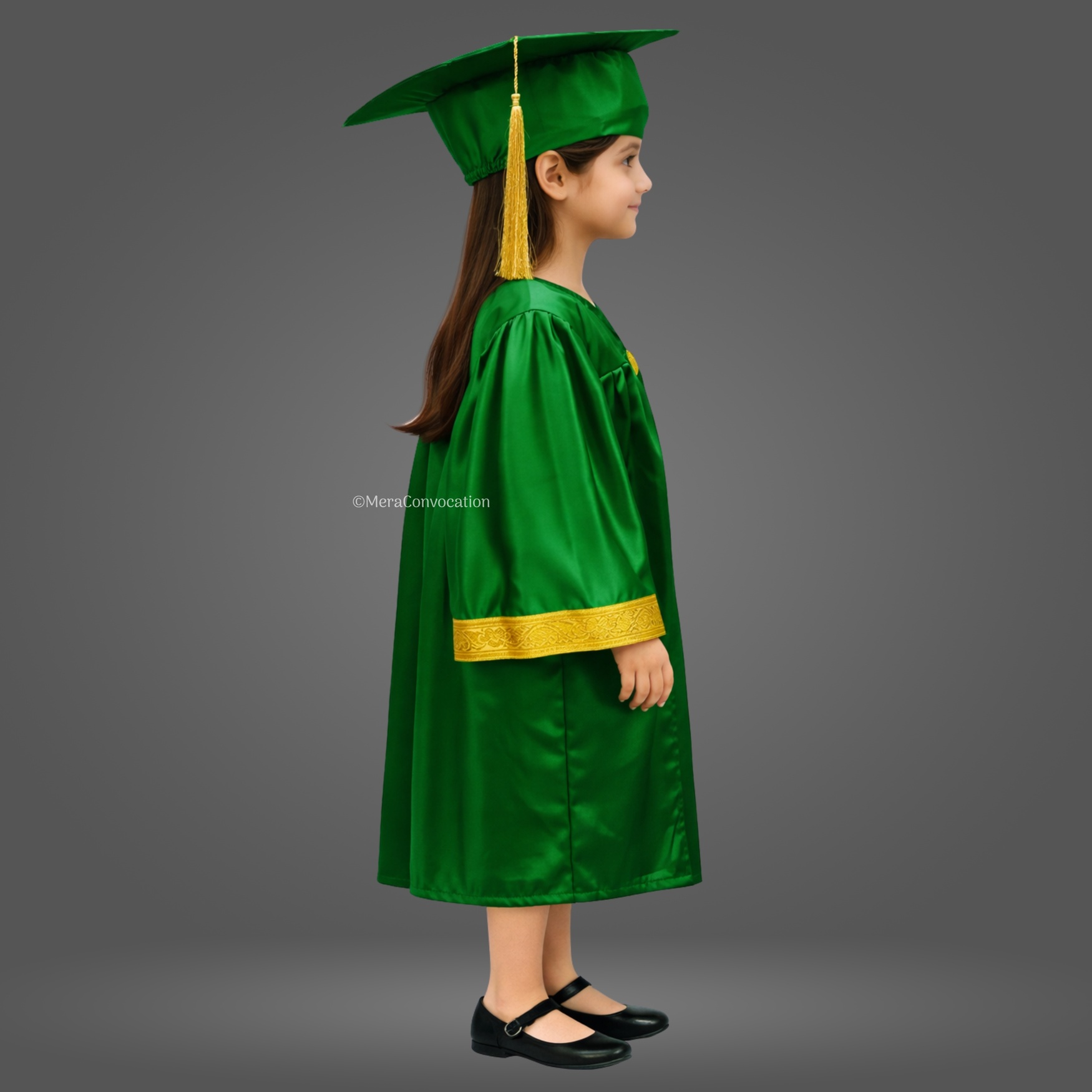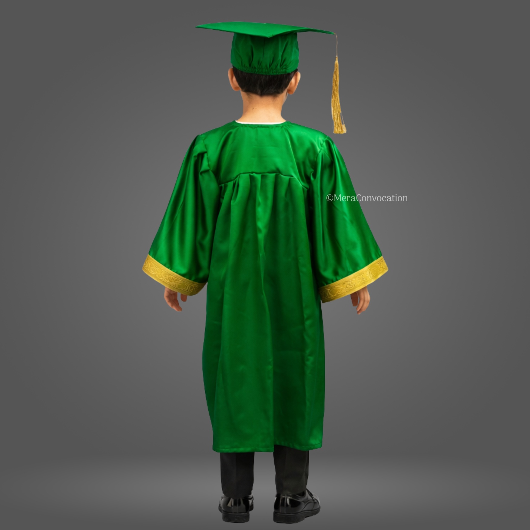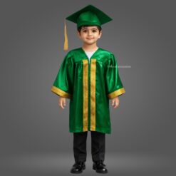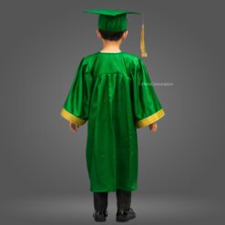 Green Shiny Nursery Kids Graduation Gown & Cap Set. Crafted from premium satin fabric with a glossy finish, this complete graduation set is designed for comfort and style.