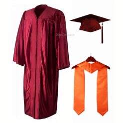 This is Maroon Glossy finish shiny Graduation Gown & Cap along with the Orange Stole. We use best quality of Satin fabric for the gown, cap & sash along with the front zipper to make this complete set of graduation robe.