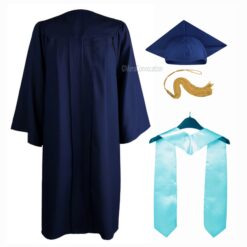 This is Navy Blue Matte Finish Graduation Gown & Cap along with the Sky Blue Stole. We use best quality of polyester fabric along with the front zipper in the gown and satin fabric for sash to make this complete set of graduation robe.