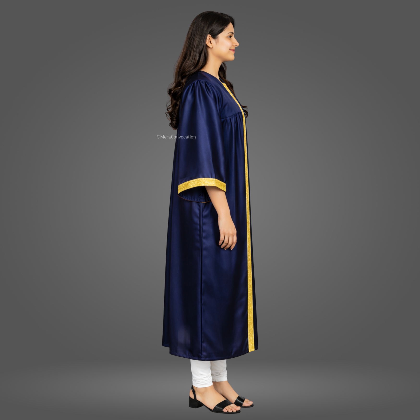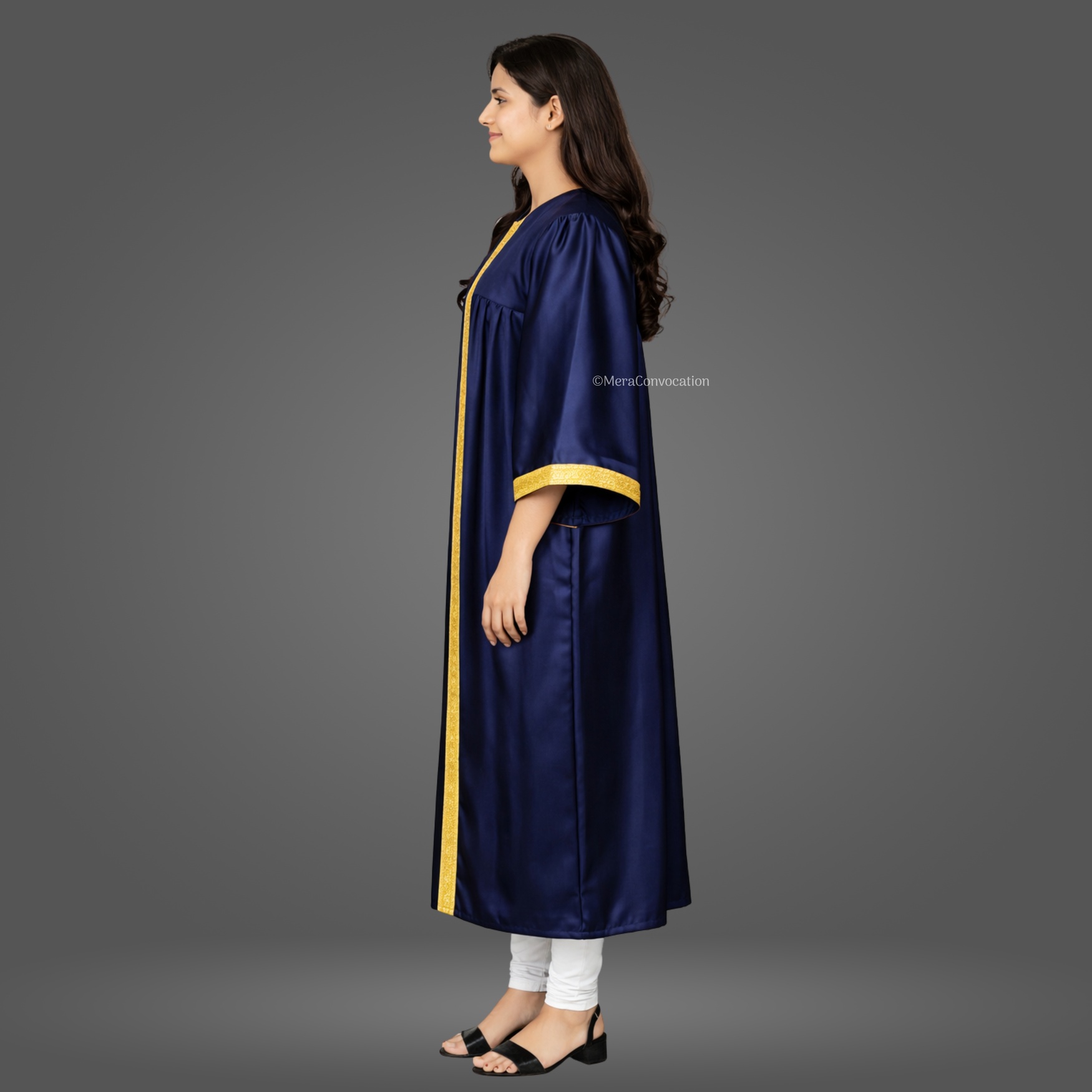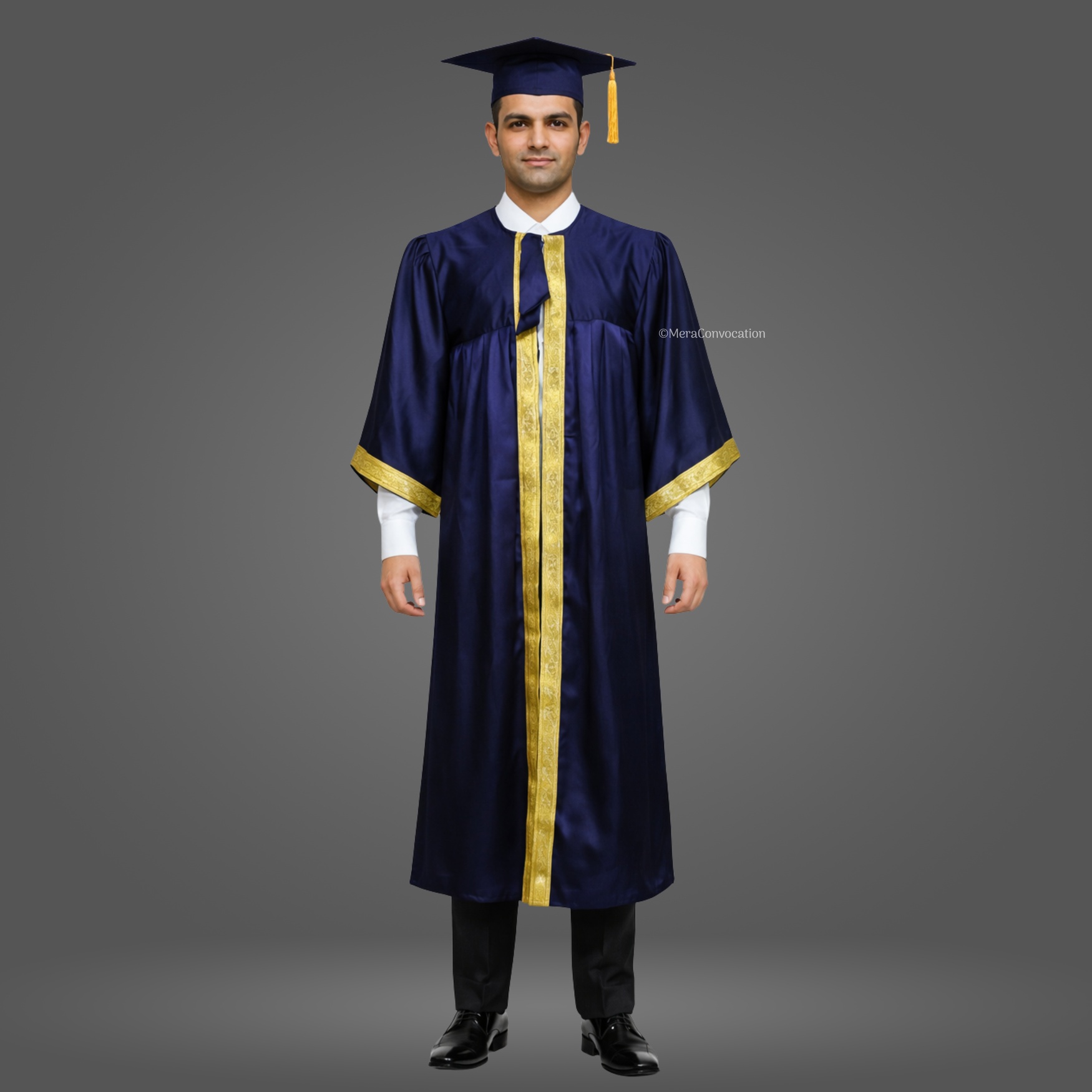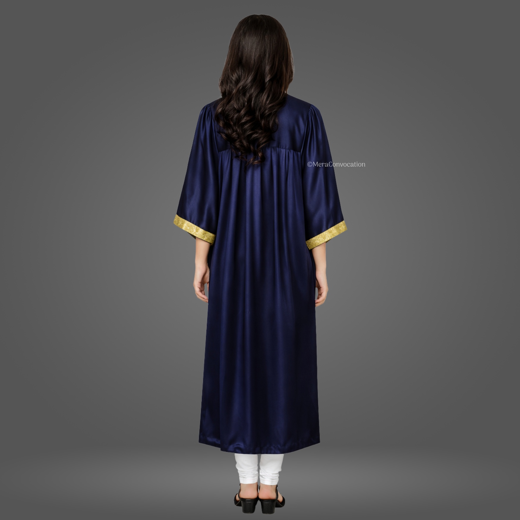 Navy Blue Shiny Graduation Gown & Cap made from premium satin with a 1.5-inch golden jari border. Perfect for graduates, teachers, HODs, and dignitaries.