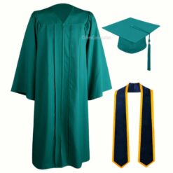 Emerald Green Matte Zipper Graduation Gown and Cap with the Navy Blue Stole and Yellow Piping! We use the best quality polyester and satin fabric to make a complete matte graduation gown, cap, and the navy blue shiny stole.