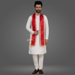 This set features a pure white cotton kurta and pajama, complemented by a red dupion cotton stole with a golden border. Crafted from high-quality cotton fabric, this ensemble ensures comfort and elegance.