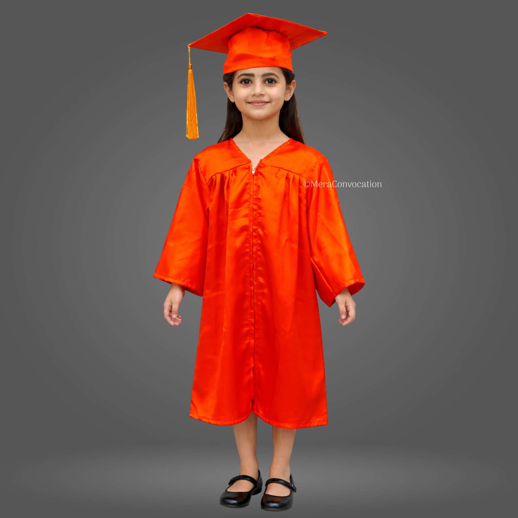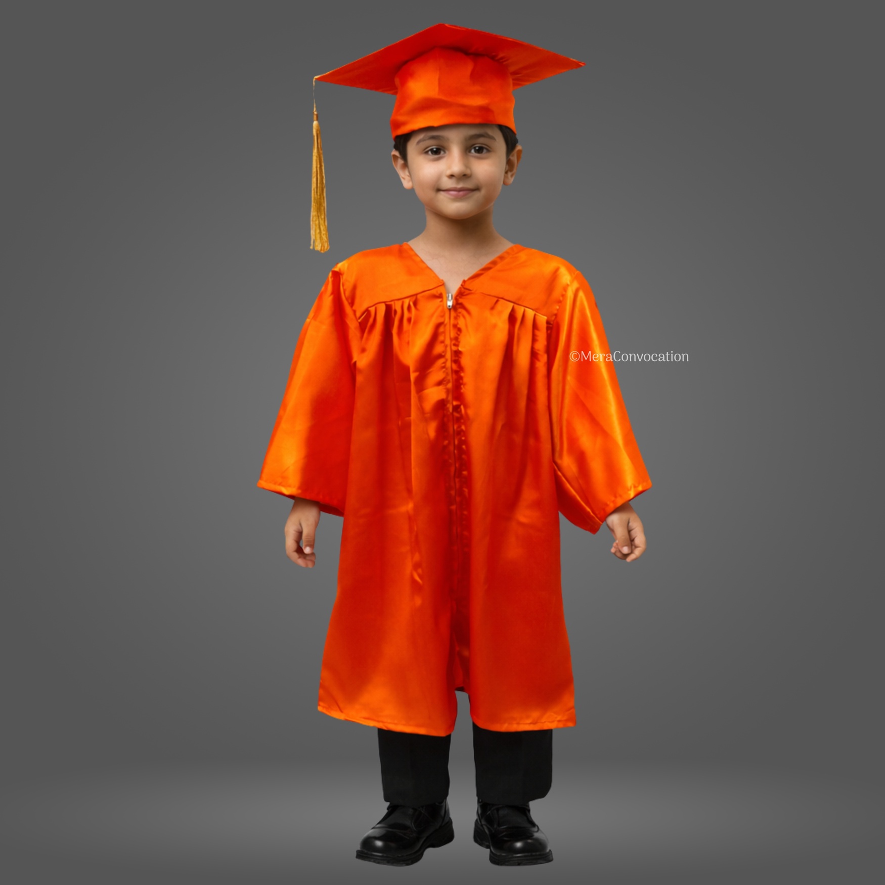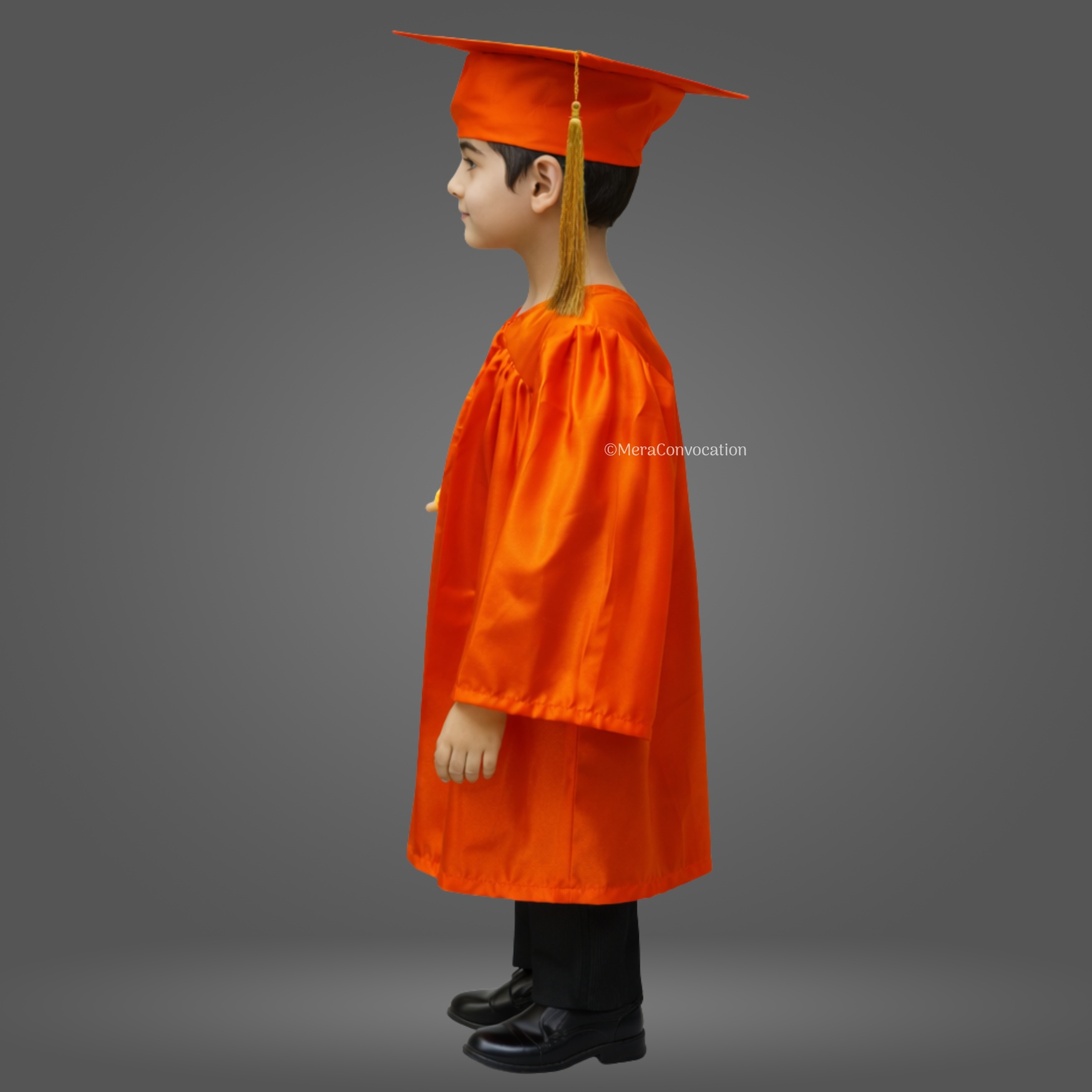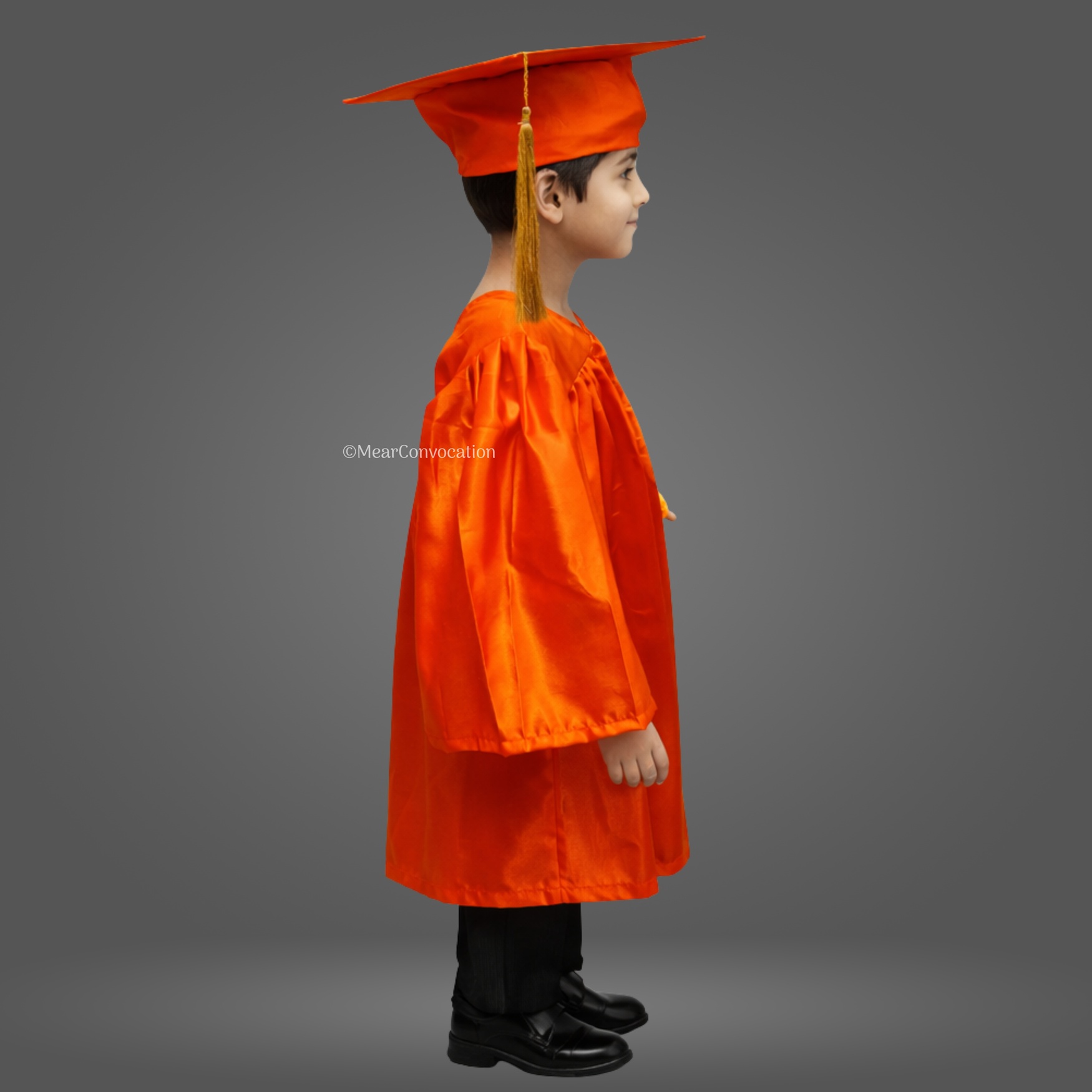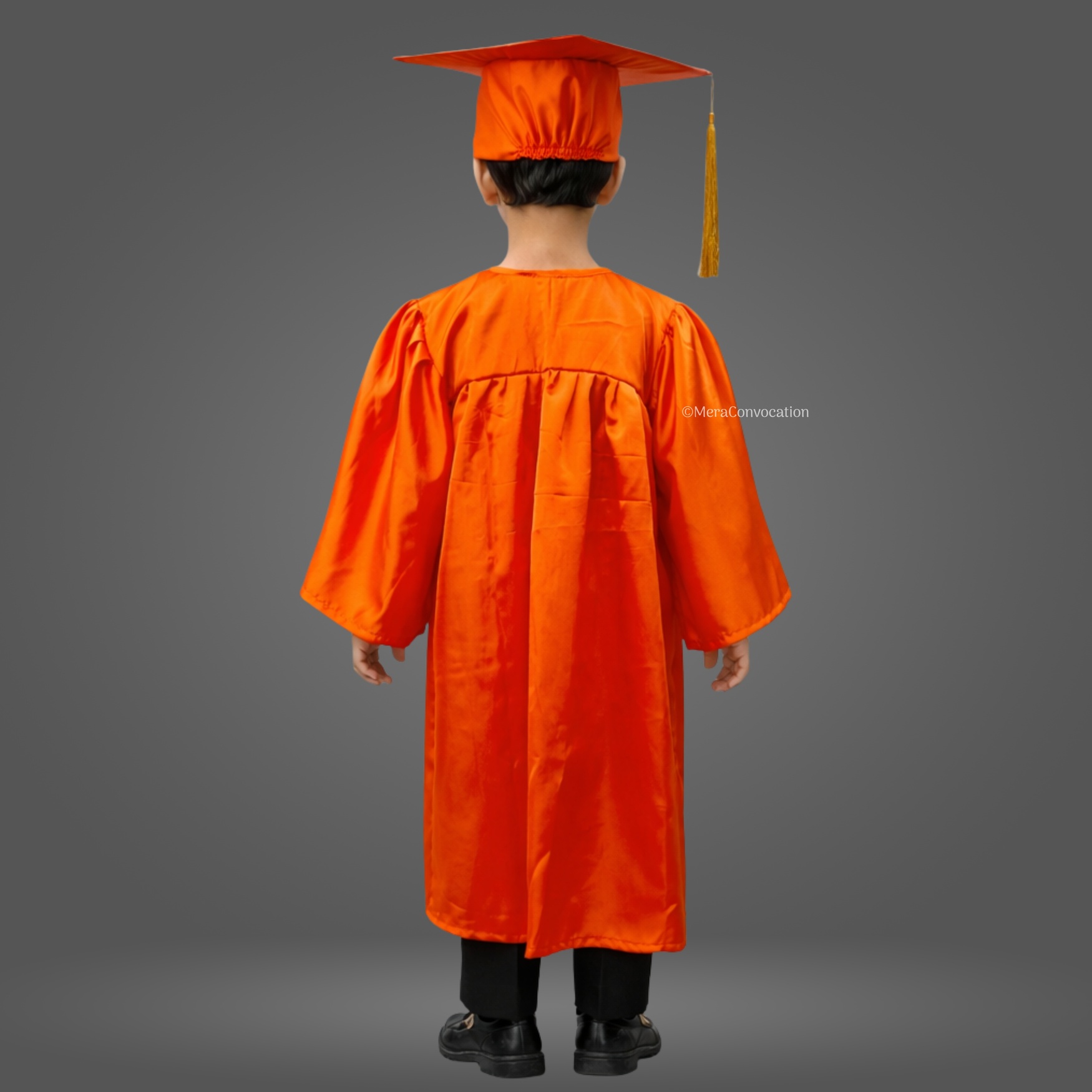 This Orange shiny Nursery & UKG graduation gown and cap add a formal, elegant touch to every graduation ceremony. Crafted from premium satin fabric, the complete set offers a glossy finish with comfort and style for little graduates.