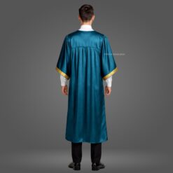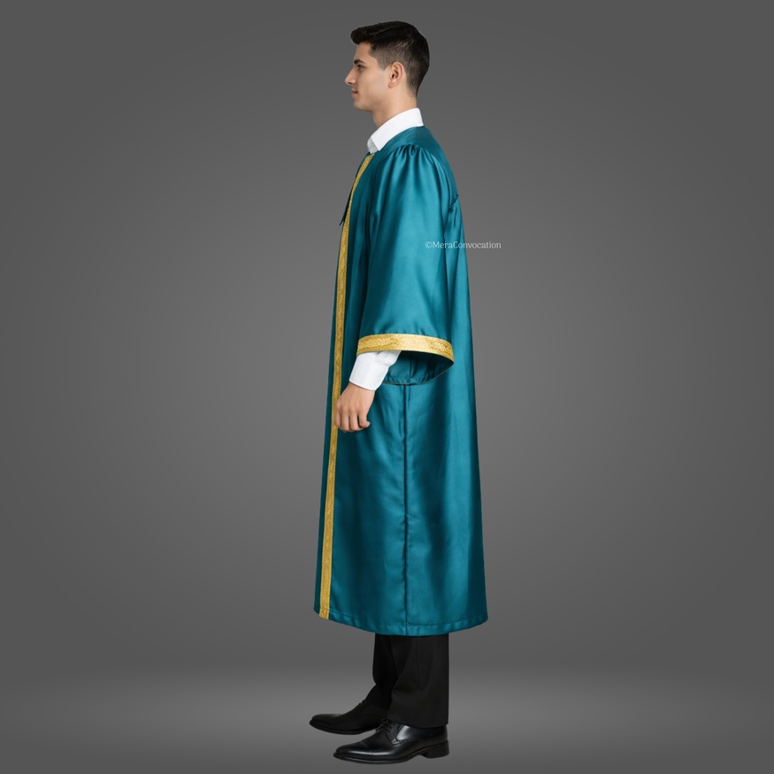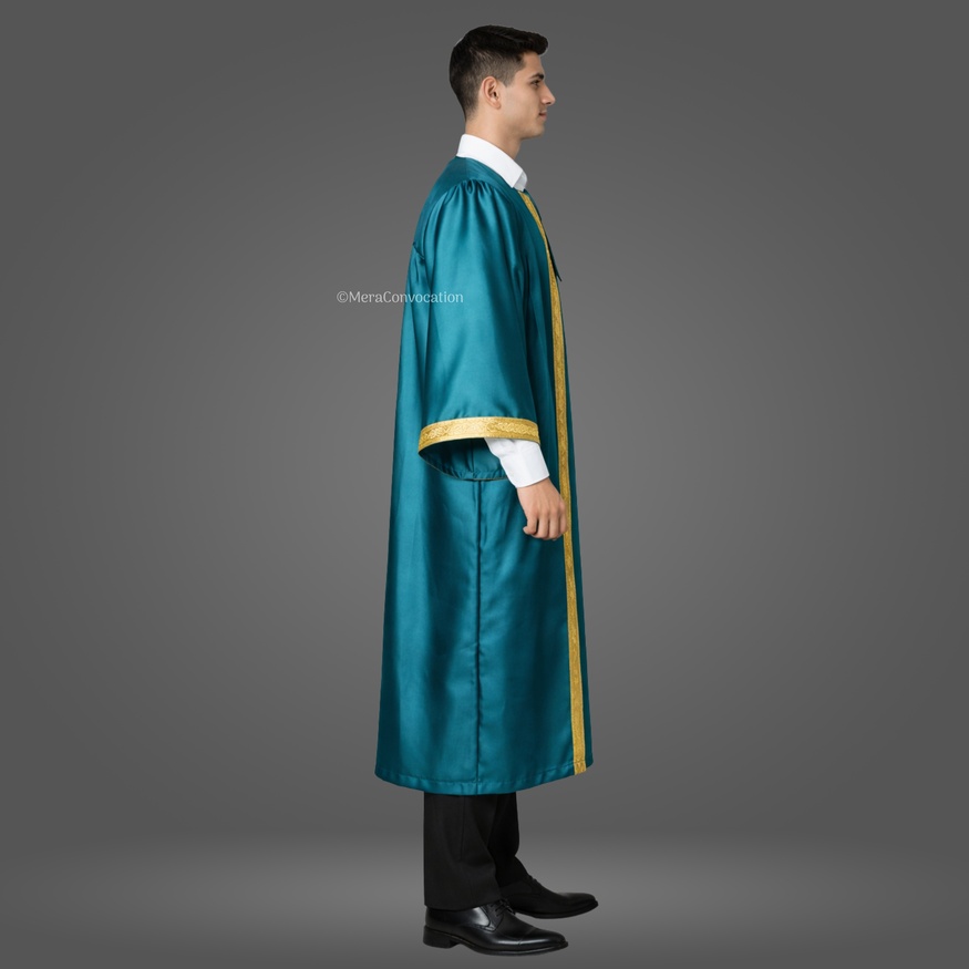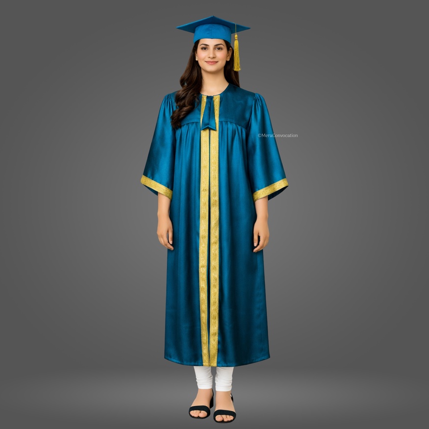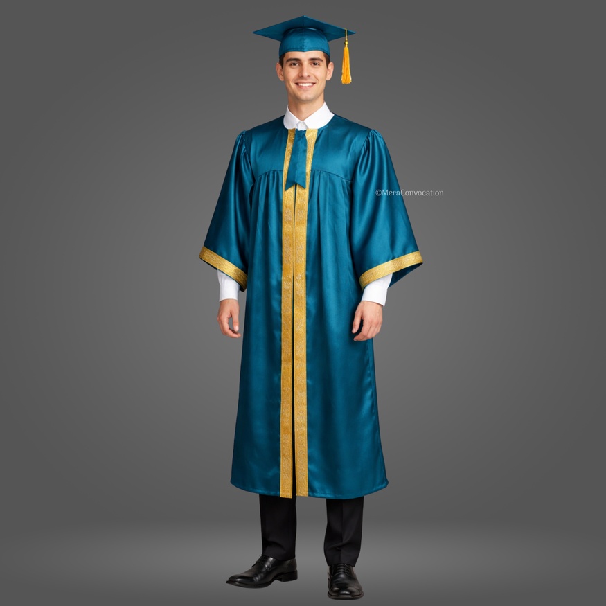 This Peacock Green Shiny (Silk) Graduation gown and cap bring a formal elegant look to your graduation ceremony. We have used the best quality satin fabric along with 1.5 inches of golden lace to make this complete set of graduation robes.