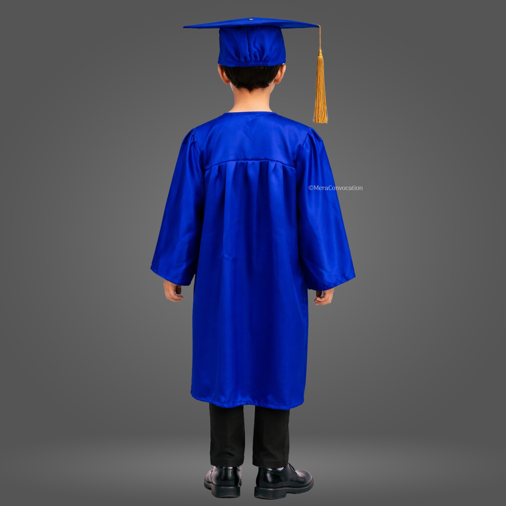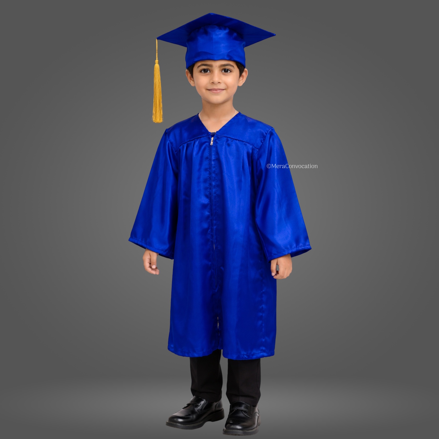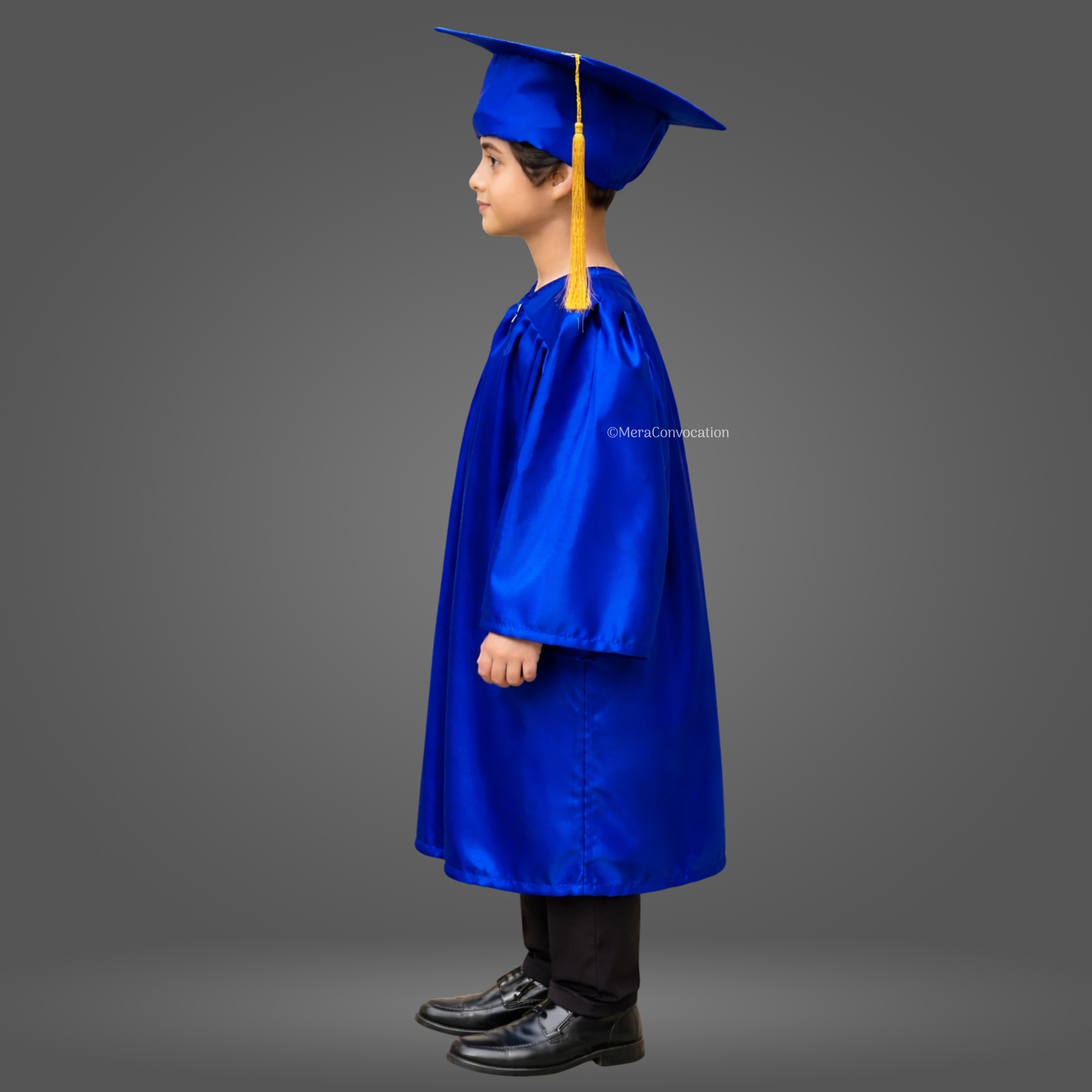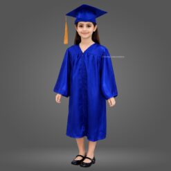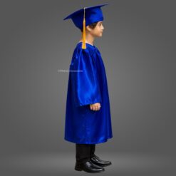 Royal Blue Shiny Nursery Kids Graduation Gown & Cap Set. Crafted from premium satin fabric with a glossy finish, this complete graduation set is designed for comfort and style.