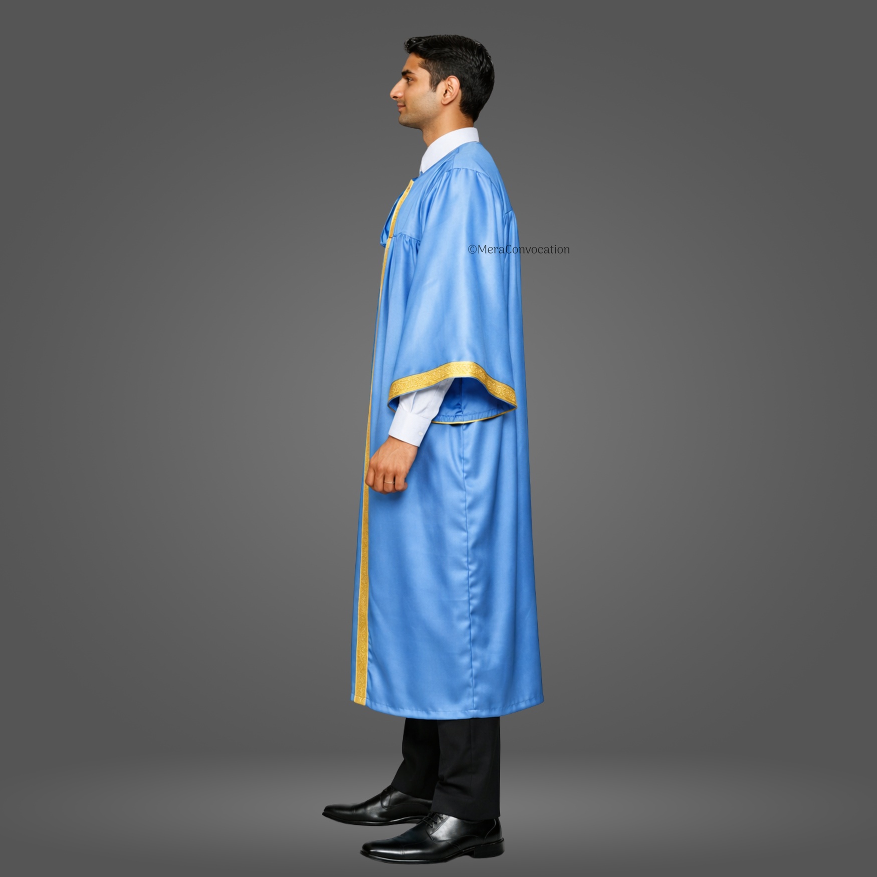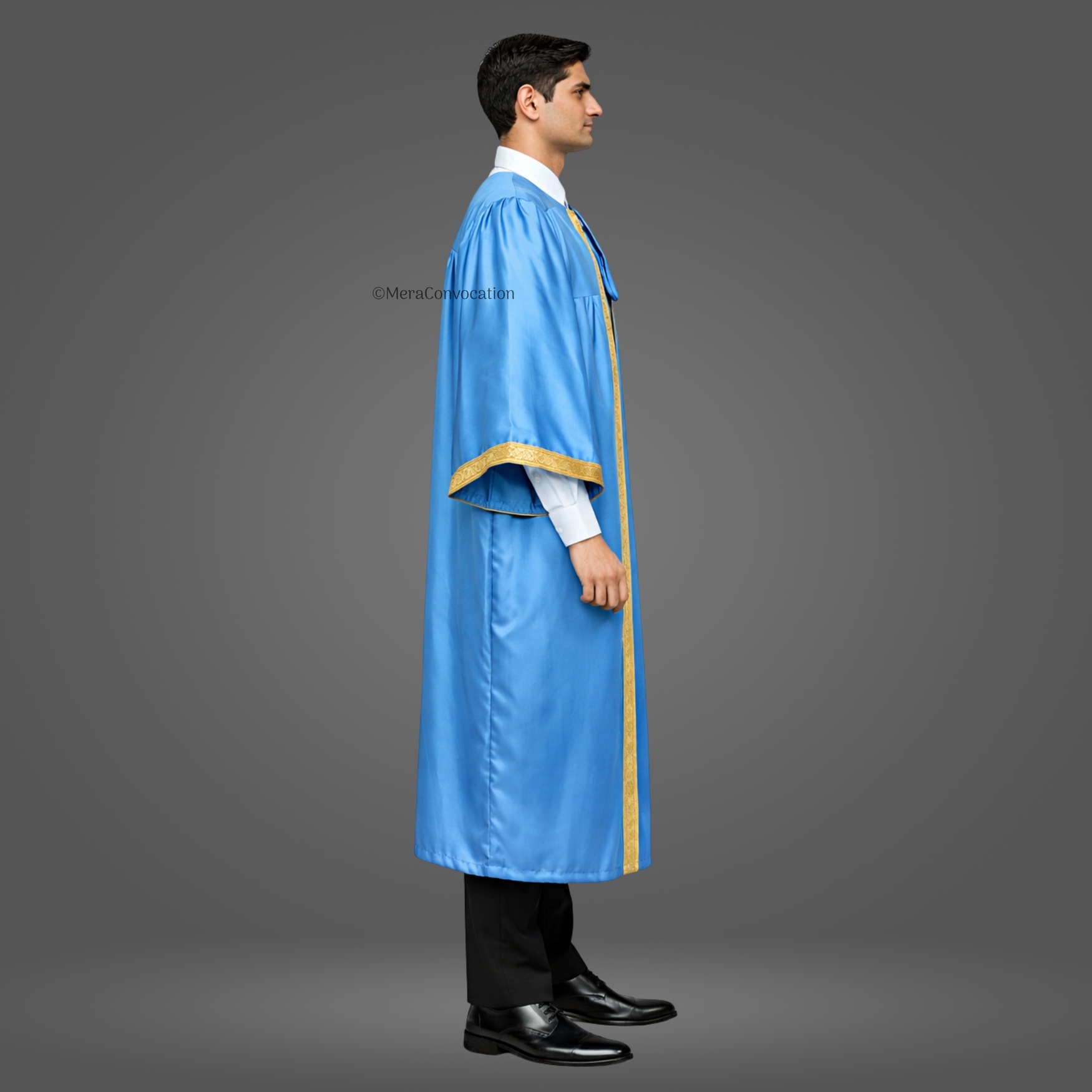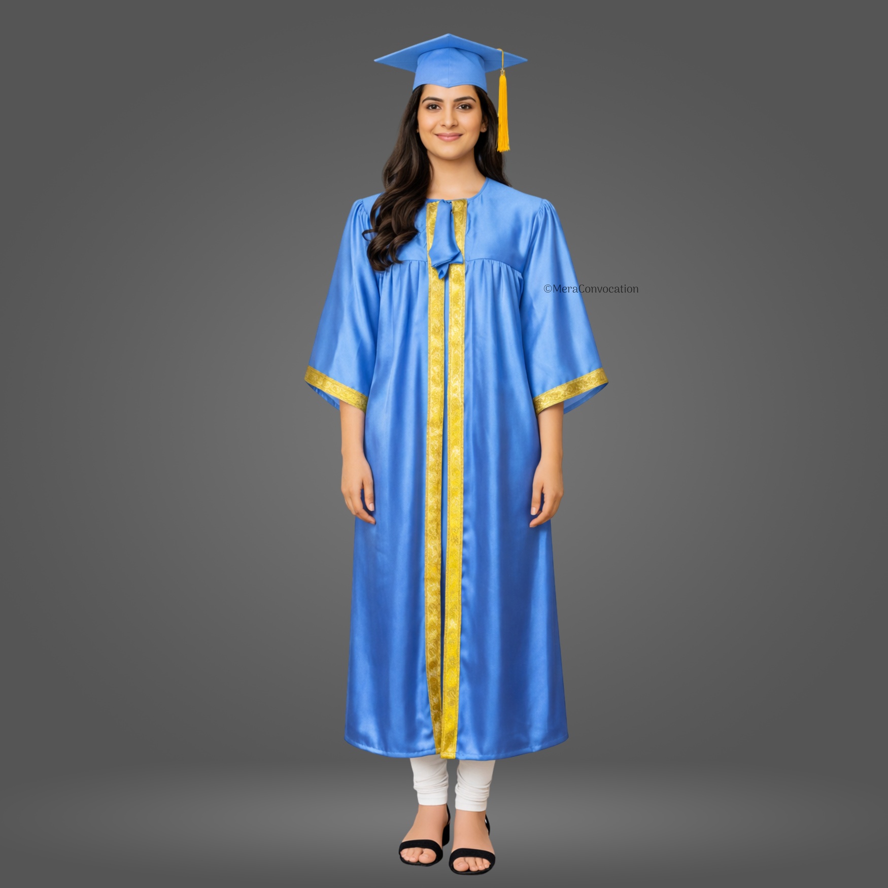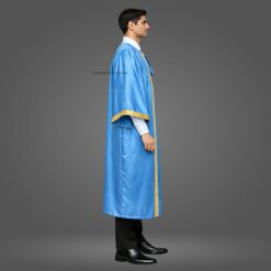This Sky Blue Shiny (Silk) Graduation gown and cap bring a formal elegant look to your graduation ceremony. We have used the best quality satin fabric along with 1.5 inches of golden lace to make this complete set of graduation robes.