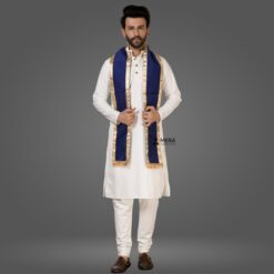 White Kurta Pajama and Navy Blue Stole with Golden Border
