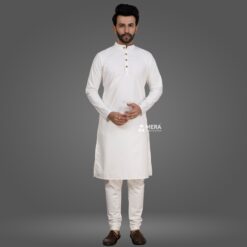 This set features a pure white cotton kurta and pajama, complemented by a peacock green dupion cotton stole. Crafted from high-quality cotton fabric, this ensemble ensures comfort and elegance.