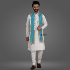 White Kurta Pajama and Sea Blue Stole with Golden Border