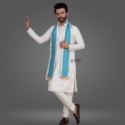 This set features a pure white cotton kurta and pajama, complemented by a sea blue dupion cotton stole with white border. Crafted from high-quality cotton fabric, this ensemble ensures comfort and elegance.