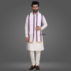 This set features a pure white cotton kurta and pajama, complemented by a white dupion cotton stole with a purple border. Crafted from high-quality cotton fabric, this ensemble ensures comfort and elegance.