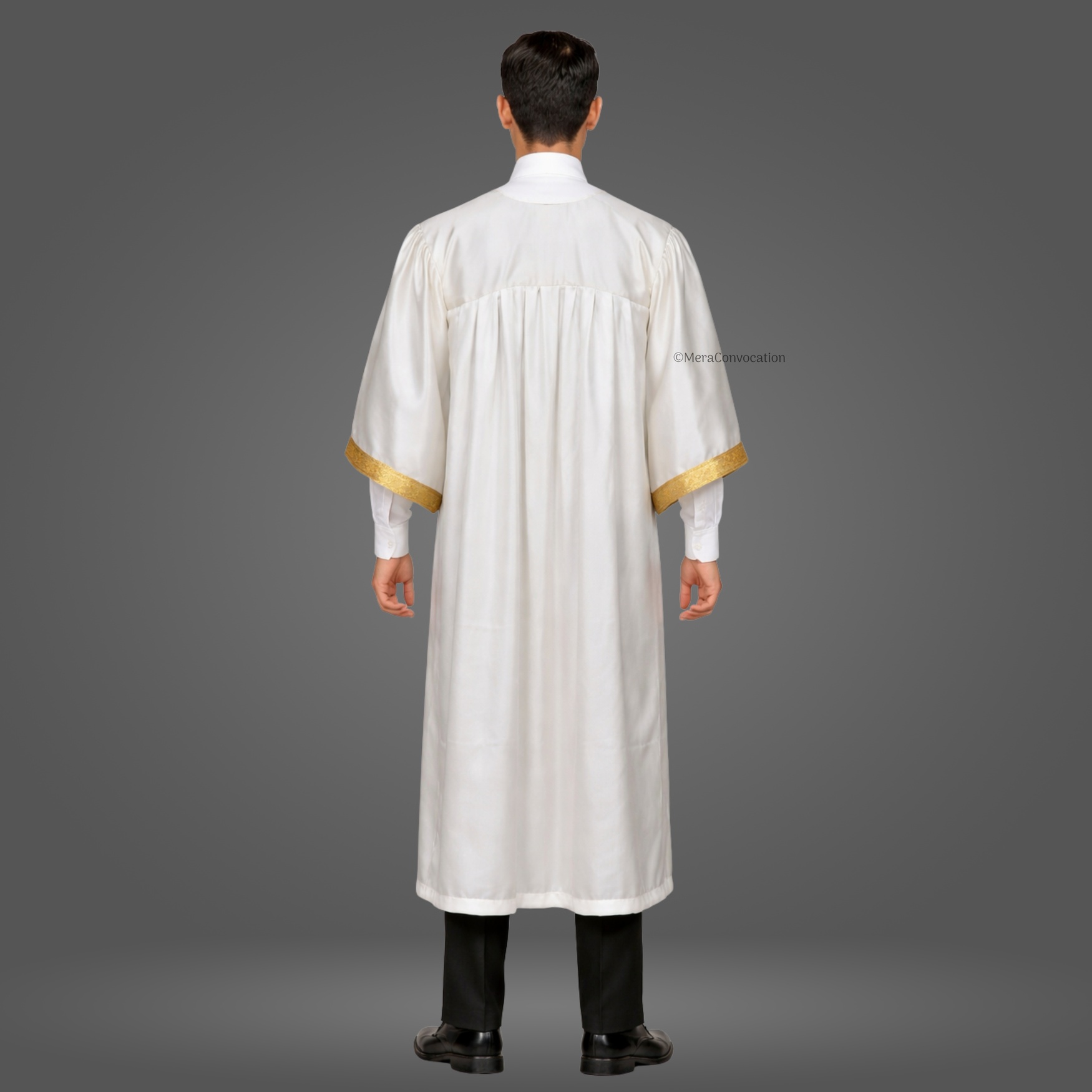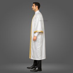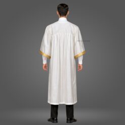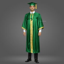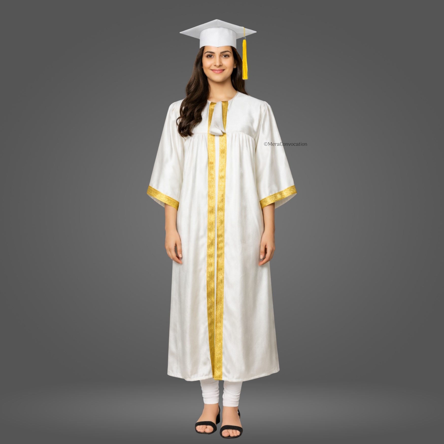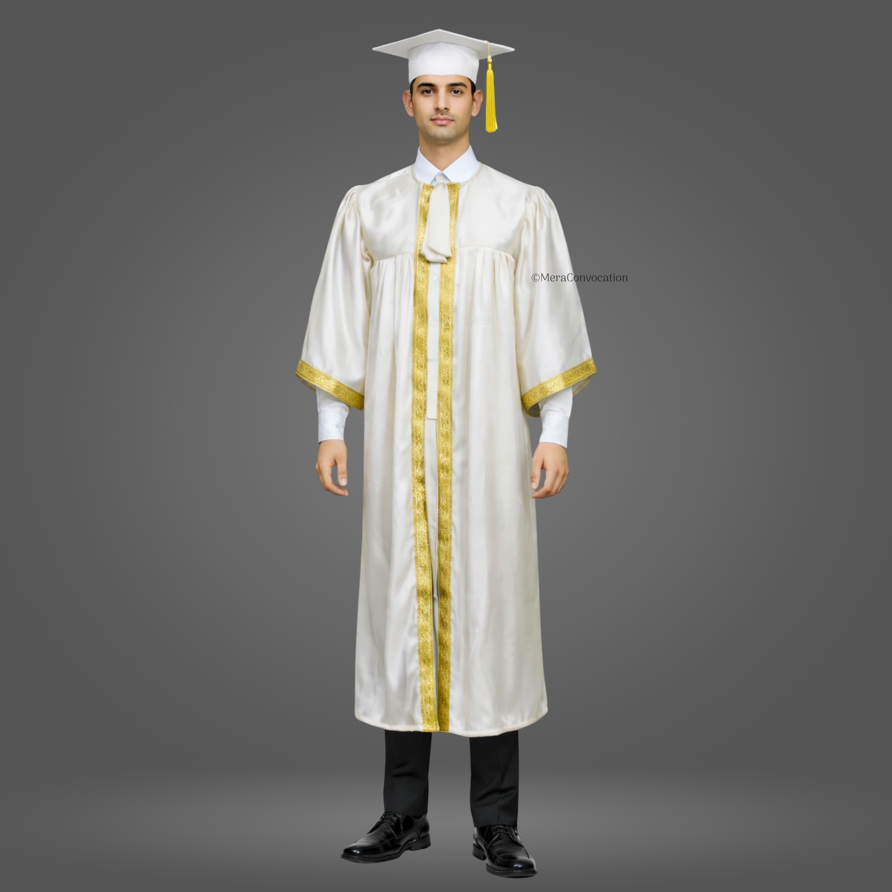 This White Shiny (Silk) Graduation Gown & Cap adds a formal and elegant touch to your ceremony. Made from premium satin fabric with a 1.5-inch golden border, this complete set is designed for a refined graduation look.
