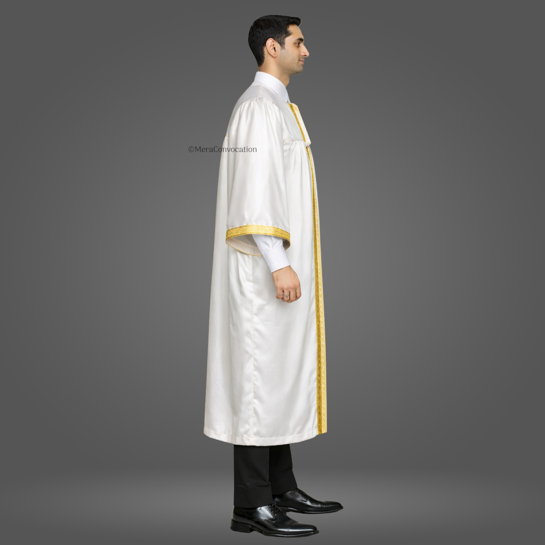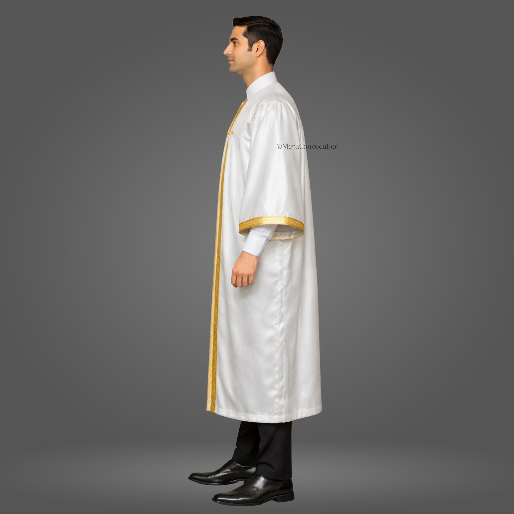White Shiny Graduation Gown & Cap made from premium satin with a 1.5-inch golden jari border. Perfect for graduates, teachers, HODs, and dignitaries.