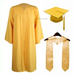 This is Yellow Matte Finish Graduation Gown & Cap along with the Cream Stole. We use best quality of polyester fabric along with the front zipper in the gown and satin fabric for sash to make this complete set of graduation robe.