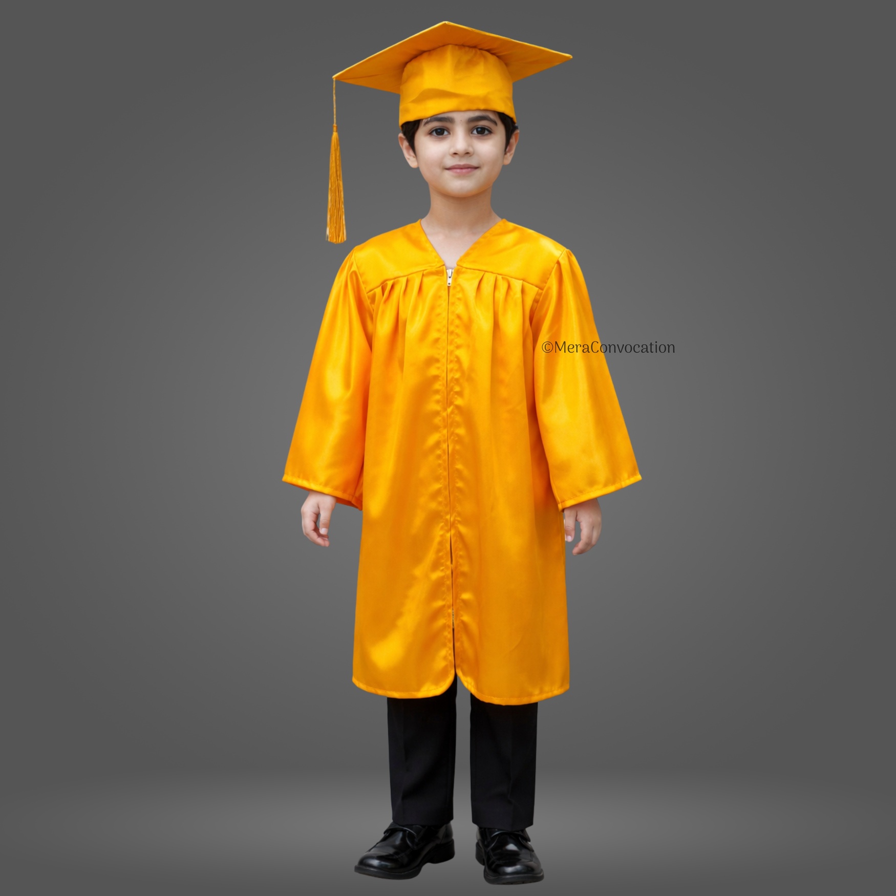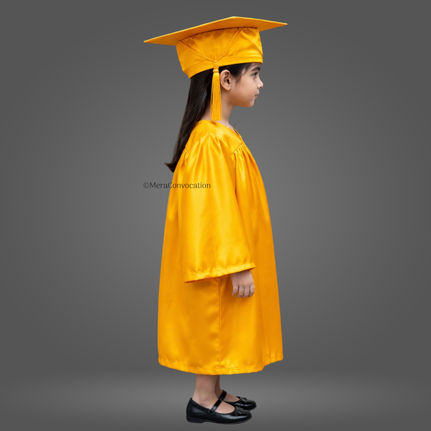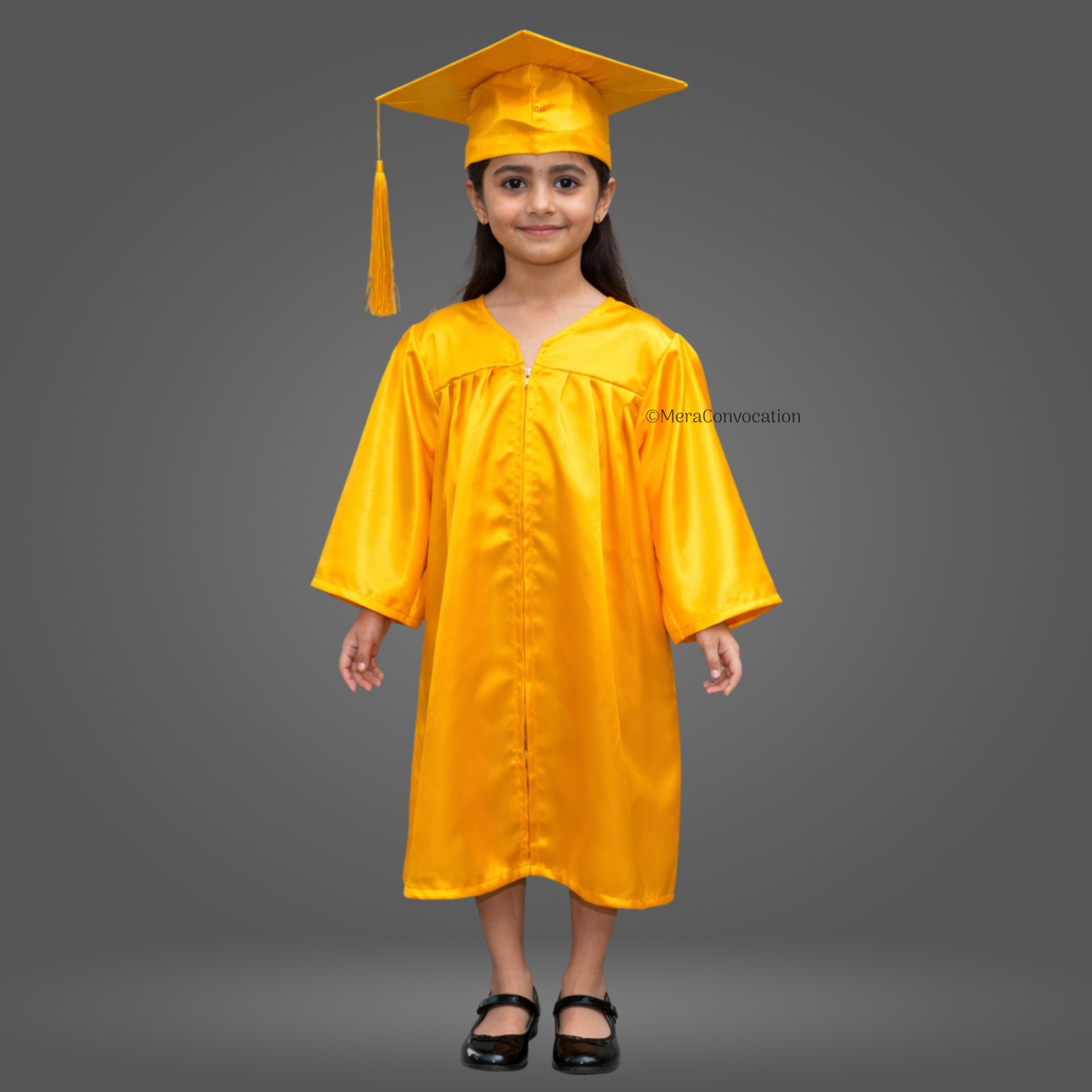 Yellow Shiny Nursery Kids Graduation Gown & Cap Set. Crafted from premium satin fabric with a glossy finish, this complete graduation set is designed for comfort and style.
